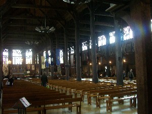 Three pictures of Old Honfleur First of all, it was a pleasure to walk ashore (most of our stops had been at anchor, thank God the weather had been on our side this cruise!). We caught the shuttle bus into Town (it was raining, after all) and had a wander. Saw Satie's house (a French composer of, mainly, piano music - try the Gymnopedies, especially number 1, if you've never heard of him). and some absolutely beautiful timber houses. Wonderful. Had a glass of wine at a street cafe (under cover!), astonishing to think that the wine was as expensive as we would expect to pay in England, and bought a 5 litre box of wine (for about £10 - not as expensive as England) in a supermarket. The wine did me very nicely for my days, later in the month, at the Guildford Cricket Festival! The high spot, however, was the Church of Sainte Catherine. What a fabulous Church. The largest wooden Church in France with a separate Bell Tower. Stupendous.